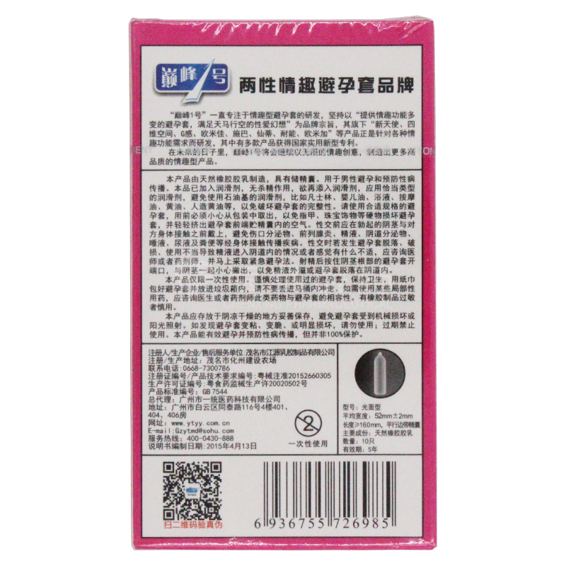 “巅峰1号”一直专注于情趣型避孕套的研发,坚持以“提供情趣功能多变的避孕套,满足天马行空的性爱幻热”为品牌宗旨,其旗下新天使、四维空间、G感、欧米佳、施巴、仙蒂、耐能、欧米加”等产品正是针对各种情趣功能需求而研发,其中有多款产品获得国家实用新型专利。