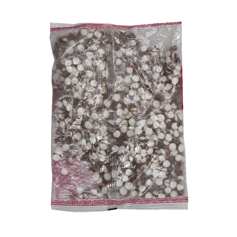 【性状】本品呈类球形,多为破粒,完整者直径5~8mm。表面有棕红色或红褐色内种皮,一端黄白色,约占全体1/3,有凹点状的种脐痕,除去内种皮显白色。质较硬,断面白色,粉性。气微,味淡。