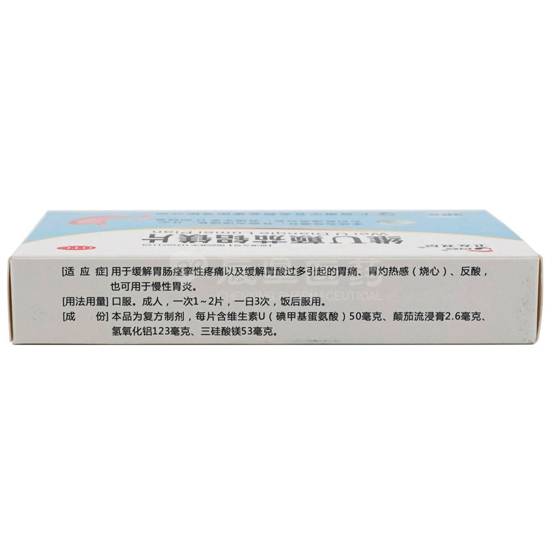 【主要成份】每片含维生素U(碘甲基蛋氨酸)50毫克、颠茄流浸膏2.6毫克、氢氧化铝123毫克、三硅酸镁53毫克