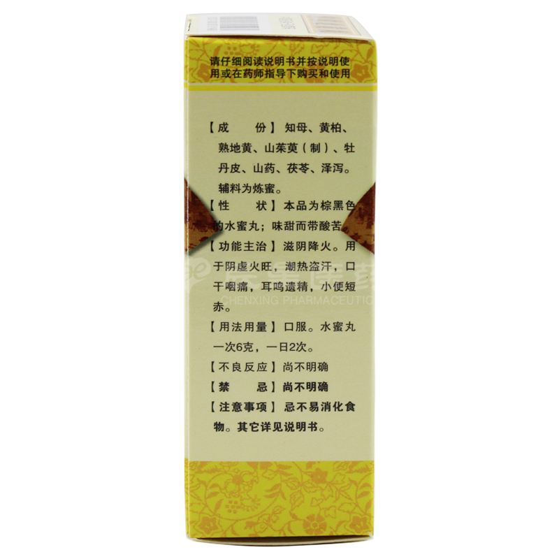 【成 份】知母、黄柏、熟地黄、山茱萸(制)、牡丹皮、山药、茯苓、泽泻。辅料为炼蜜。