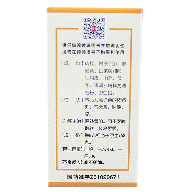 【适应症/功能主治】温补肾阳、腰膝酸软、肢冷尿频。