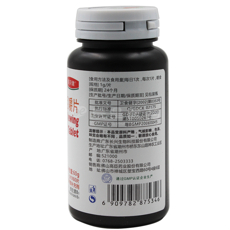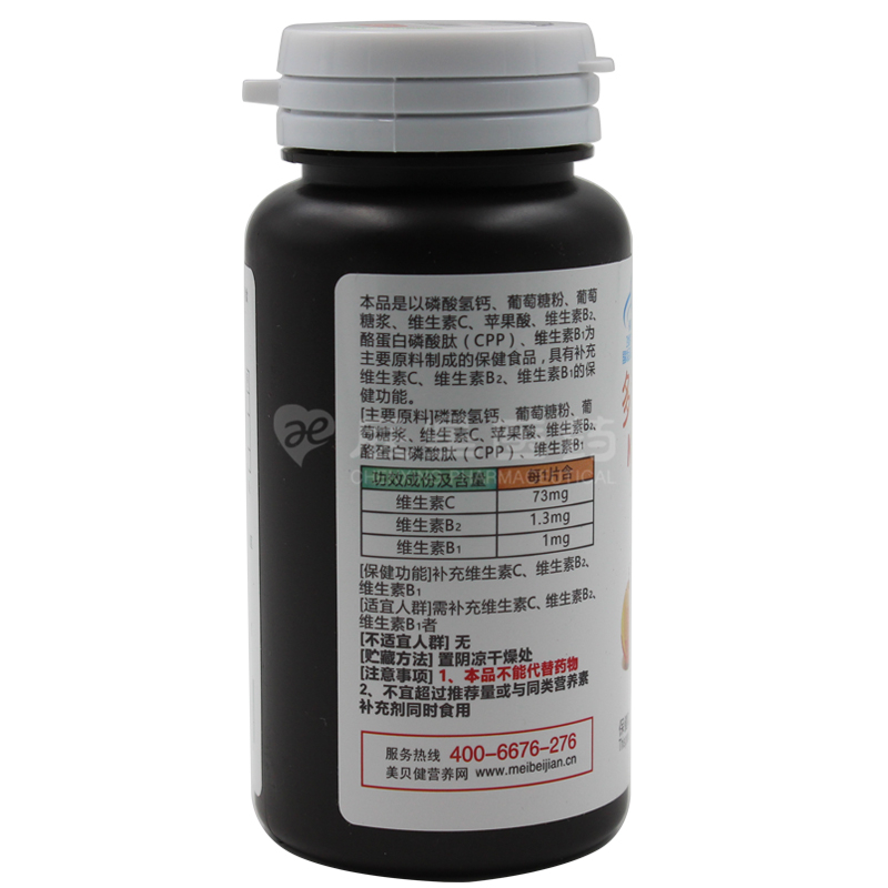 【主要原料】磷酸氢钙、葡萄糖粉、葡萄糖浆、维生素C、苹果酸、维生素B2、酪蛋白磷酸肽(CPP)、维生素B1。每1片含:维生素C 73mg、维生素B2 1.3mg、维生素B1 1mg。