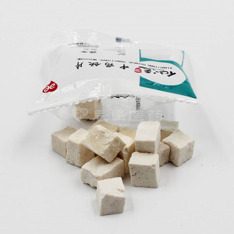 本品为多孔菌科真菌茯苓 Poria cocos (Schw.) Wolf 的干燥菌核。多于7~9月采挖,挖出后除去泥沙,堆置“发汗”后,摊开晾至表面干燥,再“发汗”,反复数次至现皱纹、内部水分大部散失后,阴干,称为“茯苓个”;或将鲜茯苓按不同部位切制,阴干,分别称为“茯苓块”和“茯苓片”。