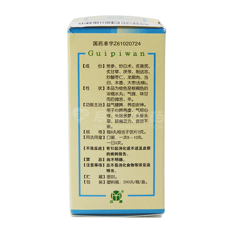【成 份】党参、白术(炒)、炙黄芪、茯苓、远志(制)、酸枣仁(炒)、龙眼肉、当归、木香、大枣(去核)、炙甘草。
