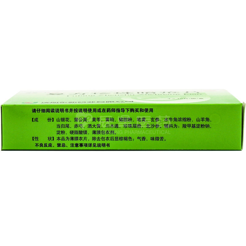 【主要成份】金银花、蒲公英、当归尾、地黄、黄柏、大黄、水牛角浓缩粉、羚羊角、北沙参、黄芩、赤芍、珍珠层粉等16味。