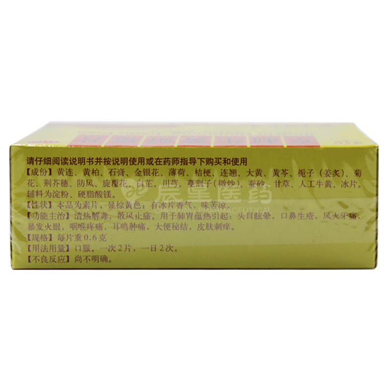 【主要成份】黄连、黄柏、石膏、金银花、薄荷、桔梗、连翘、大黄、黄芩、栀子(姜炙)、菊花、荆芥穗、防风、旋覆花、白芷、川芎、蔓荆子(微炒)、蚕砂、甘草、人工牛黄、冰片。辅料为淀粉、硬脂酸镁。