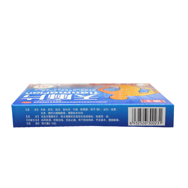 【主要成份】天麻、羌活、独活、盐杜仲、牛膝、粉萆解、附子(制)、当归、地黄、玄参。辅料:薄膜包衣材料、硬脂酸镁。