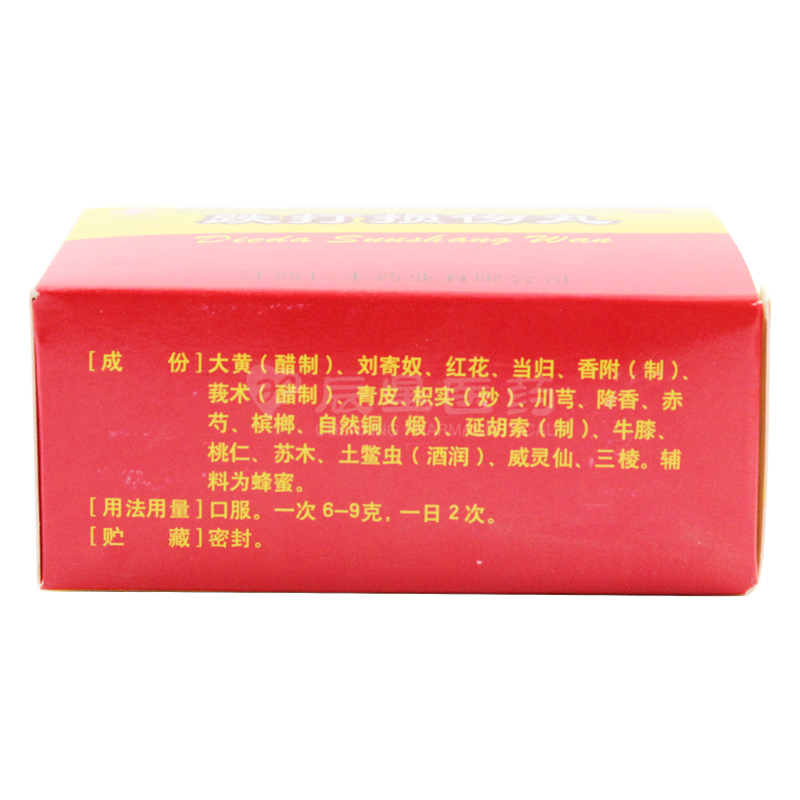 【主要成份】三七、当归、白芍、赤芍、桃仁、红花、血竭、北刘寄奴、骨碎补(烫)、续断、苏木、牡丹皮、乳香(制)、没药(制)、姜黄、三棱(醋制)、防风、甜瓜子、枳实(炒)、桔梗。